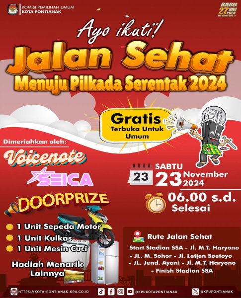 Ayo Ikuti Jalan Sehat Menuju Pilkada Serentak 2024 yang akan diadakan pada Hari Sabtu, 23 November 2024 mulai pukul 06.00 s.d. selesai.