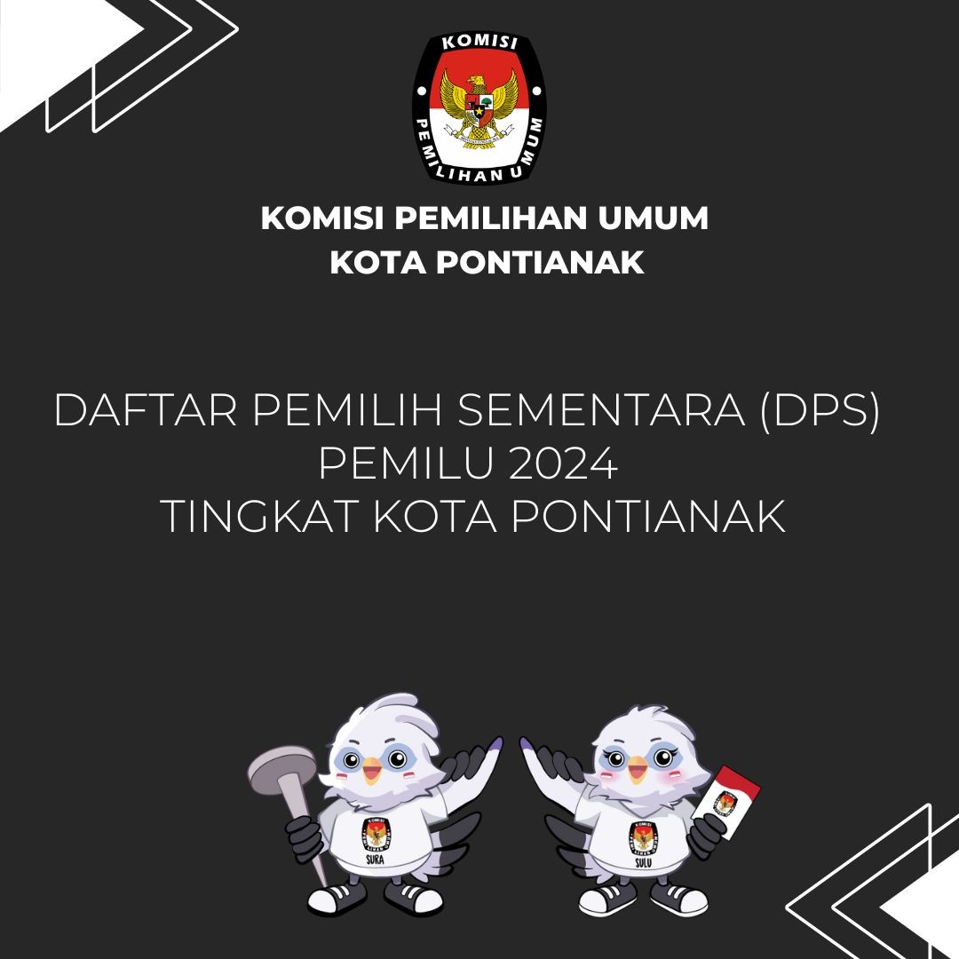 Daftar Pemilih Sementara (DPS) Pemilu 2024 Tingkat Kota Pontianak Rabu, 03 Mei 2023 12:00 3220 Kecamatan PONTIANAK KOTA Kecamatan PONTIANAK BARAT Kecamatan PONTIANAK SELATAN Kecamatan PONTIANAK TENGGARA Kecamatan PONTIANAK TIMUR Kecamatan PONTIANAK UTARA DPS Se-Kota Pontianak :Pengumuman DPS Tingkat Kota Pontianak Bagikan: Dilihat 3,220 Kali.