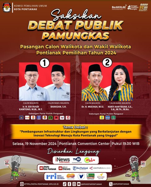Debat ini akan menjadi momen penting bagi masyarakat untuk mendalami visi dan program pasangan calon terkait dengan isu-isu krusial yang akan menentukan arah pembangunan Kota Pontianak di masa depan. Tema yang diangkat berfokus pada upaya pembangunan infrastruktur yang berkelanjutan, pengelolaan lingkungan yang ramah teknologi, serta inovasi yang dapat mendukung pencapaian Kota Pontianak yang unggul di berbagai sektor.