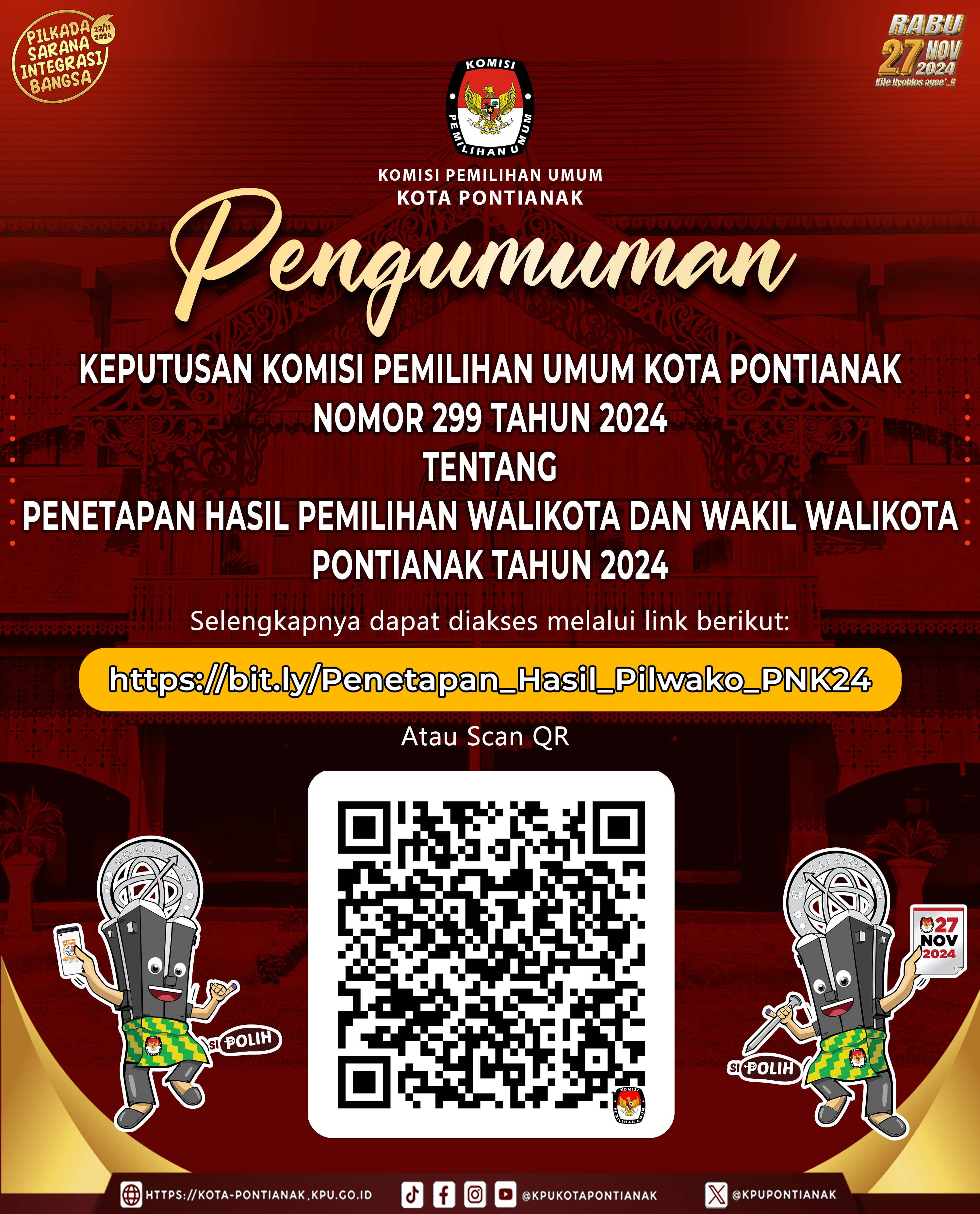 Pontianak, kota-pontianak.kpu.go.id/ - Berikut Keputusan Komisi Pemilihan Umum Kota Pontianak Nomor 299 Tahun 2024 Tentang Penetapan Hasil Pemilihan Walikota dan Wakil Walikota Pontianak Tahun 2024. Selengkapnya dapat di Unduh di: