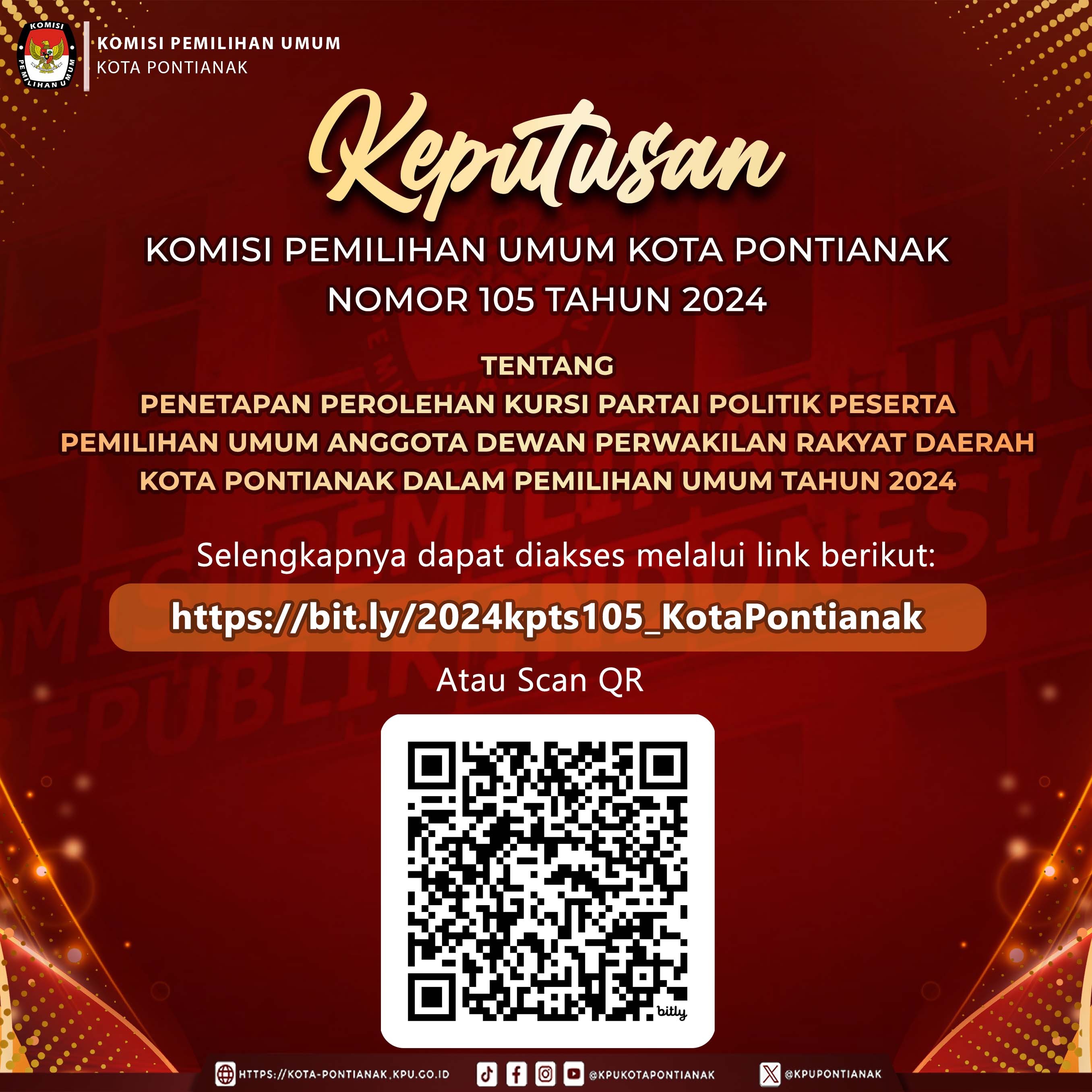 Keputusan KPU Kota Pontianak Nomor 105 Tahun 2024 tentang Penetepan Perolehan Kursi Partai Politik Peserta Pemilihan Umum Anggota DPRD Kota Pontianak dalam Pemilihan Umum Tahun 2024