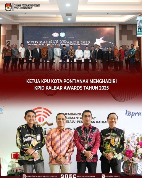 Pontianak, — Ketua KPU Kota Pontianak menghadiri acara KPID Kalbar Awards Tahun 2025 yang diselenggarakan oleh Komisi Penyiaran Indonesia Daerah (KPID) Kalimantan Barat. Kegiatan ini berlangsung di Aula Garuda, Gedung Pelayanan Terpadu Kantor Gubernur Kalimantan Barat, pada Selasa (16/7).