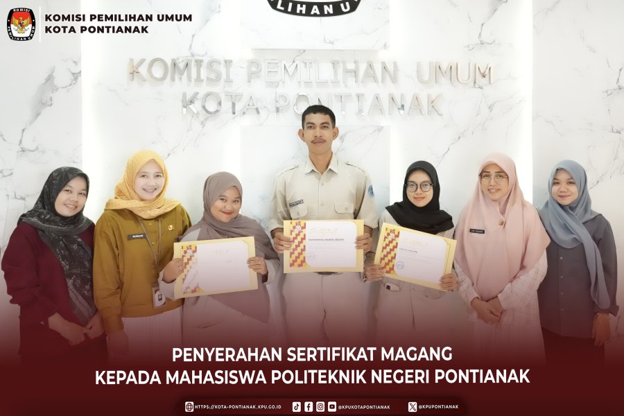 Pontianak, 15 Mei 2025 — Komisi Pemilihan Umum (KPU) Kota Pontianak menyerahkan sertifikat magang kepada mahasiswa Politeknik Negeri Pontianak (Polnep) yang telah menyelesaikan program kuliah kerja pamong. Penyerahan sertifikat dilaksanakan di Kantor KPU Kota Pontianak.