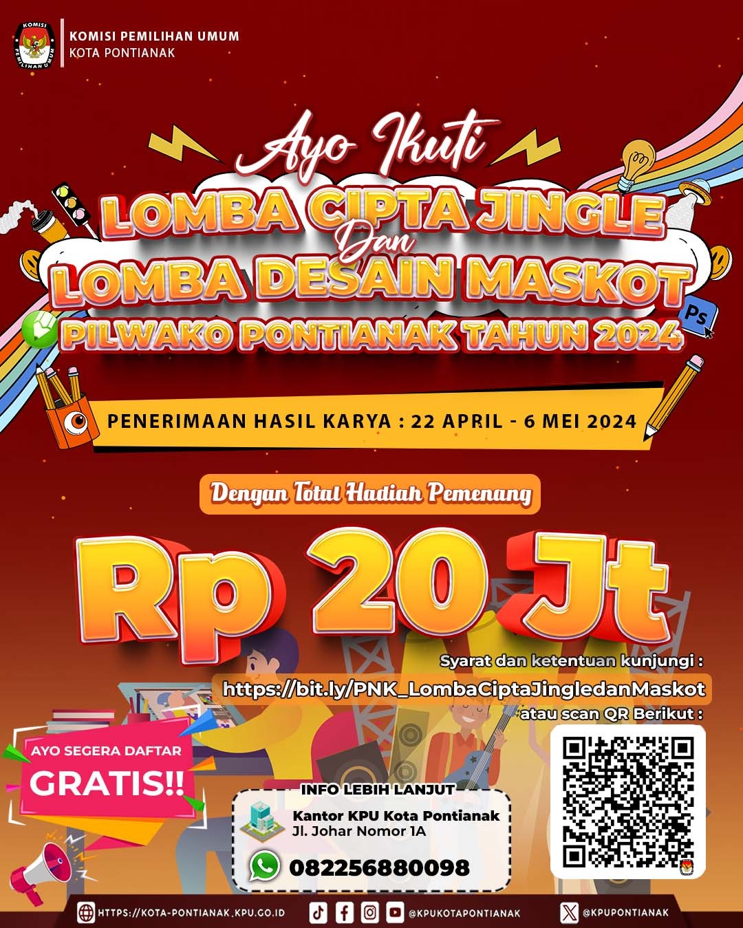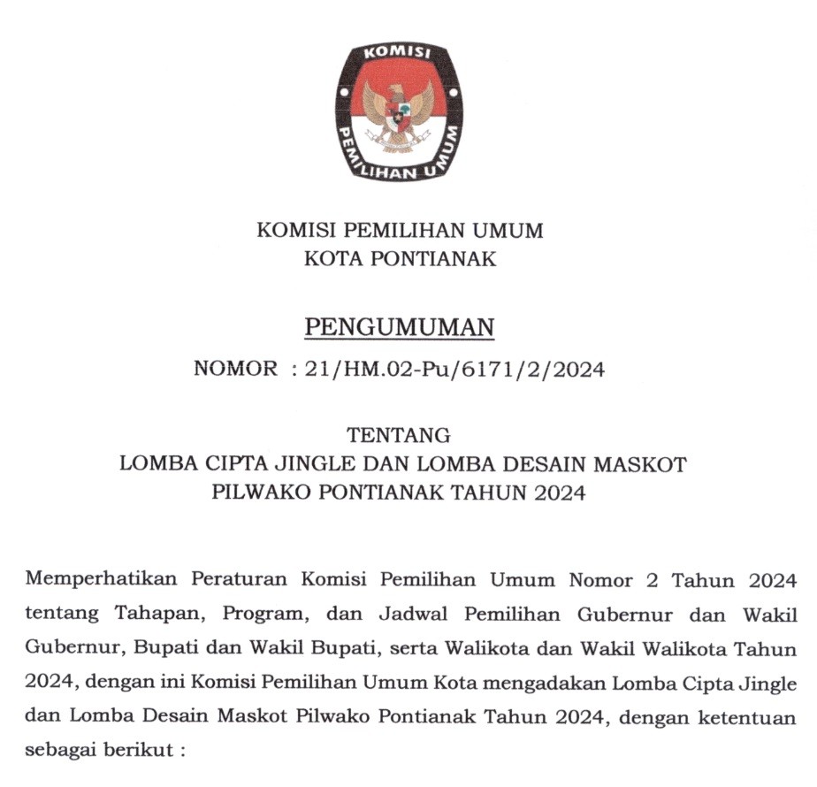 Pontianak, kota-pontianak.kpu.go.id/ - Berikut disampaikan Pengumuman Nomor : 21/HM.02-Pu/6171/2/2024 tentang Lomba Cipta Jingle dan Lomba Desain Maskot Pilwako Pontianak Tahun 2024.