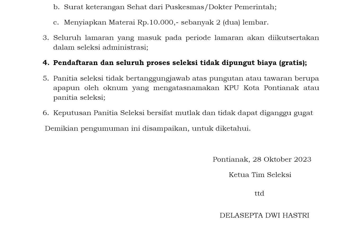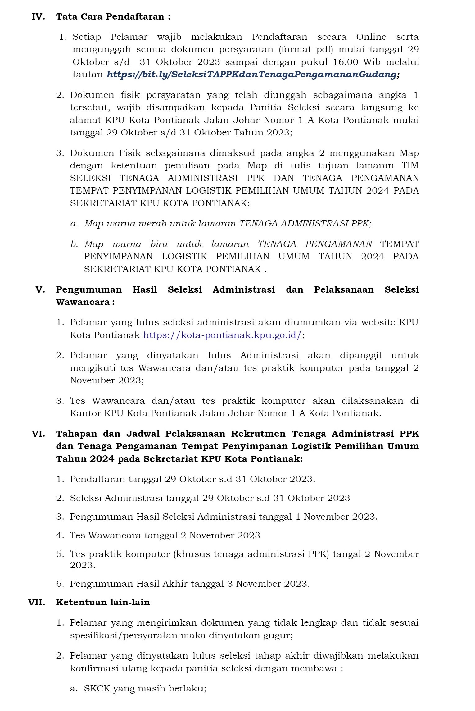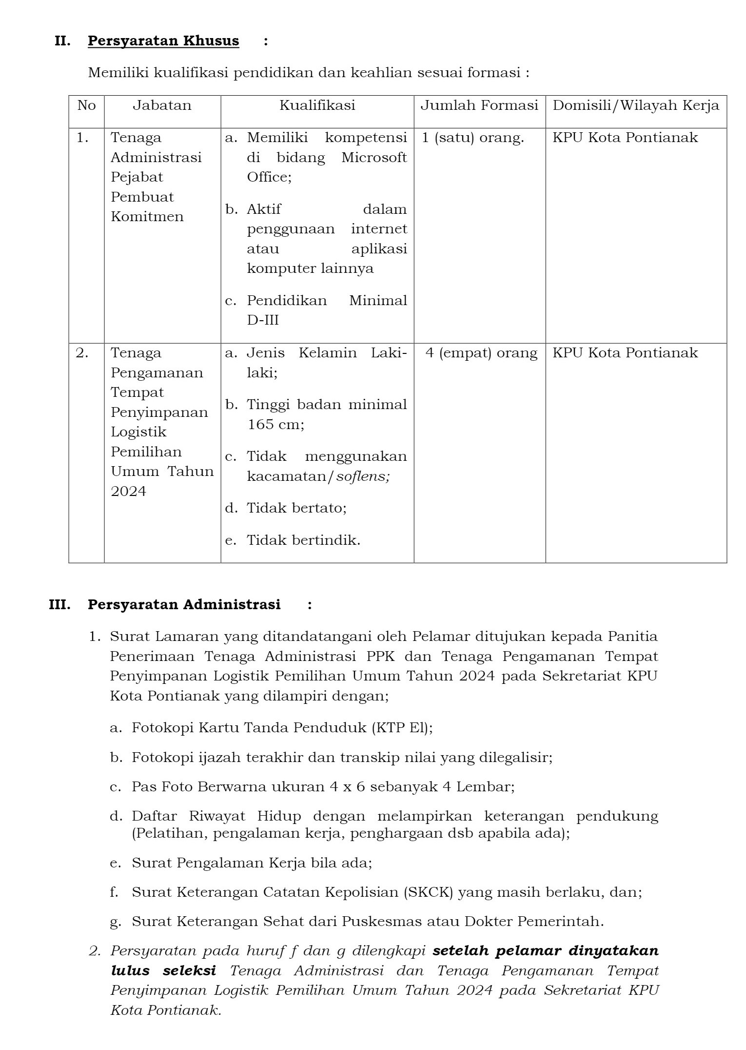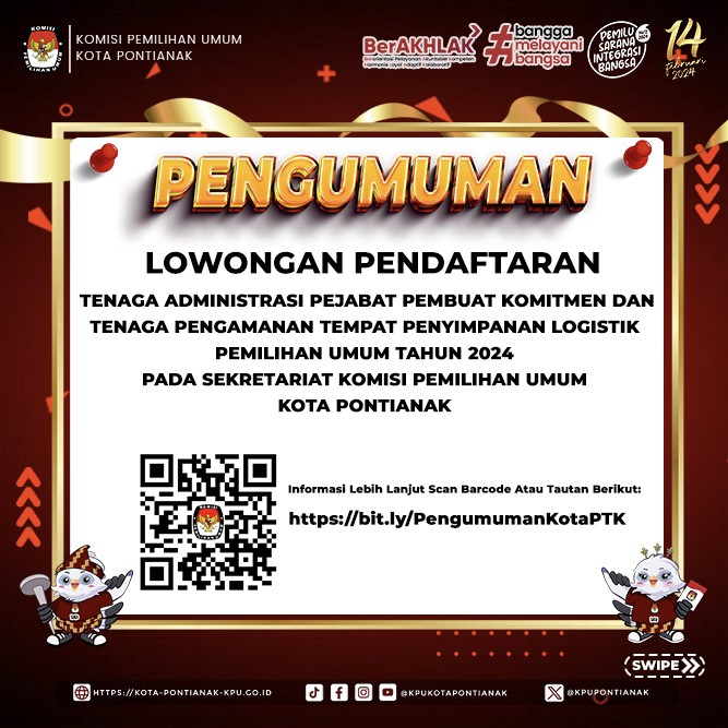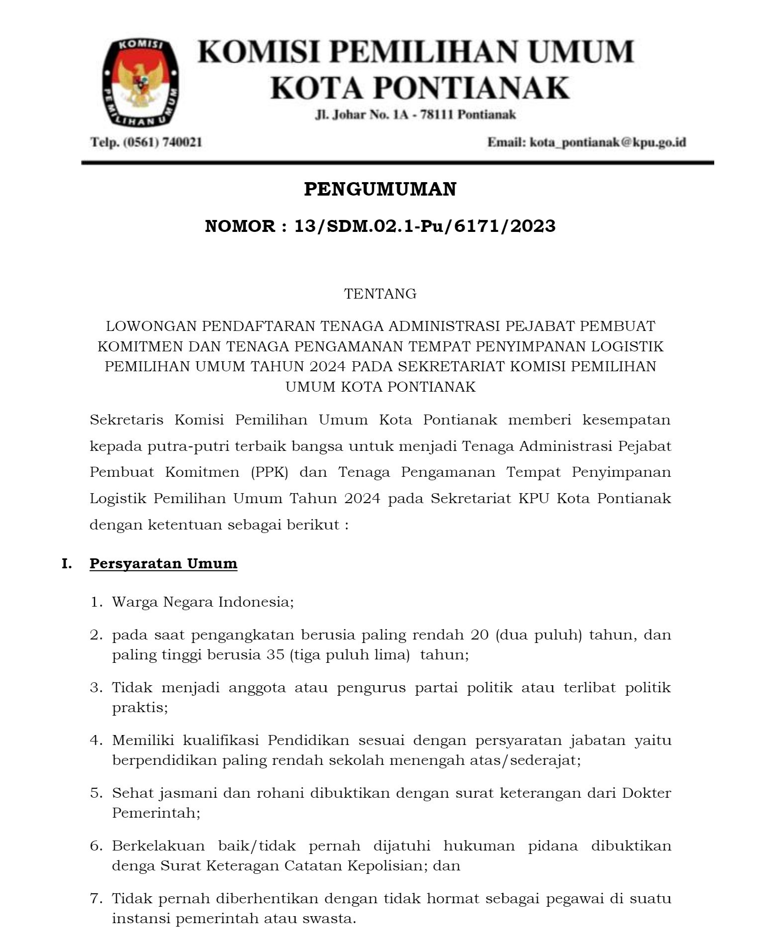 LOWONGAN PENDAFTARAN TENAGA ADMINISTRASI PEJABAT PEMBUAT KOMITMEN DAN TENAGA PENGAMANAN TEMPAT PENYIMPANAN LOGISTIK PEMILIHAN UMUM TAHUN 2024 Sabtu, 28 Oktober 2023 19:00 841 FIle PDF: LOWONGAN PENDAFTARAN TENAGA ADMINISTRASI PEJABAT PEMBUAT KOMITMEN DAN TENAGA PENGAMANAN TEMPAT PENYIMPANAN LOGISTIK PEMILIHAN UMUM TAHUN 2024 PADA SEKRETARIAT KOMISI PEMILIHAN UMUM KOTA PONTIANAK Bagikan: Dilihat 841 Kali.