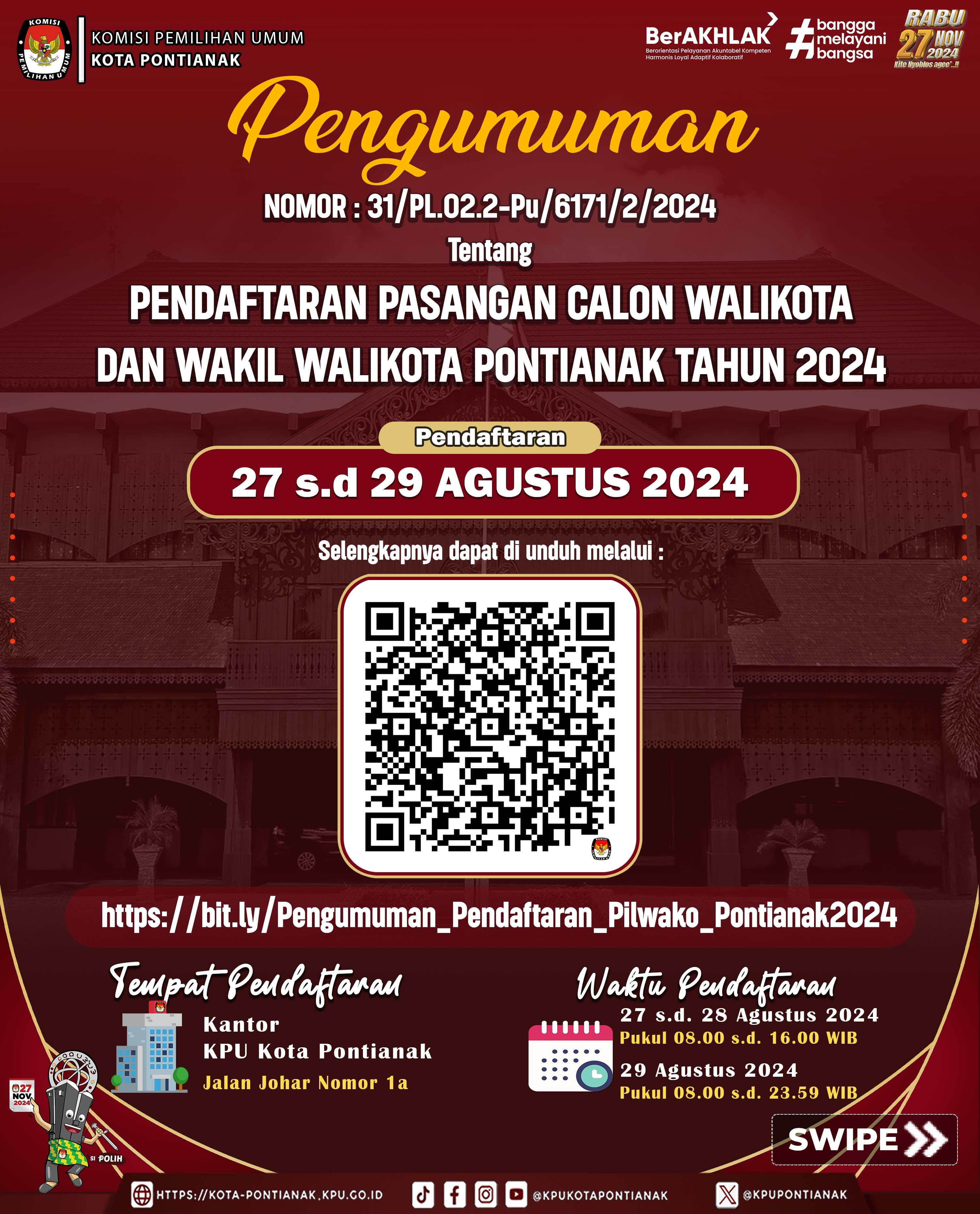 Pontianak, kota-pontianak.kpu.go.id/- Berikut Pengumuman Pendaftaran Pasangan Calon Walikota dan Wakil Walikota Pontianak Tahun 2024.