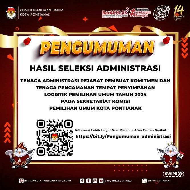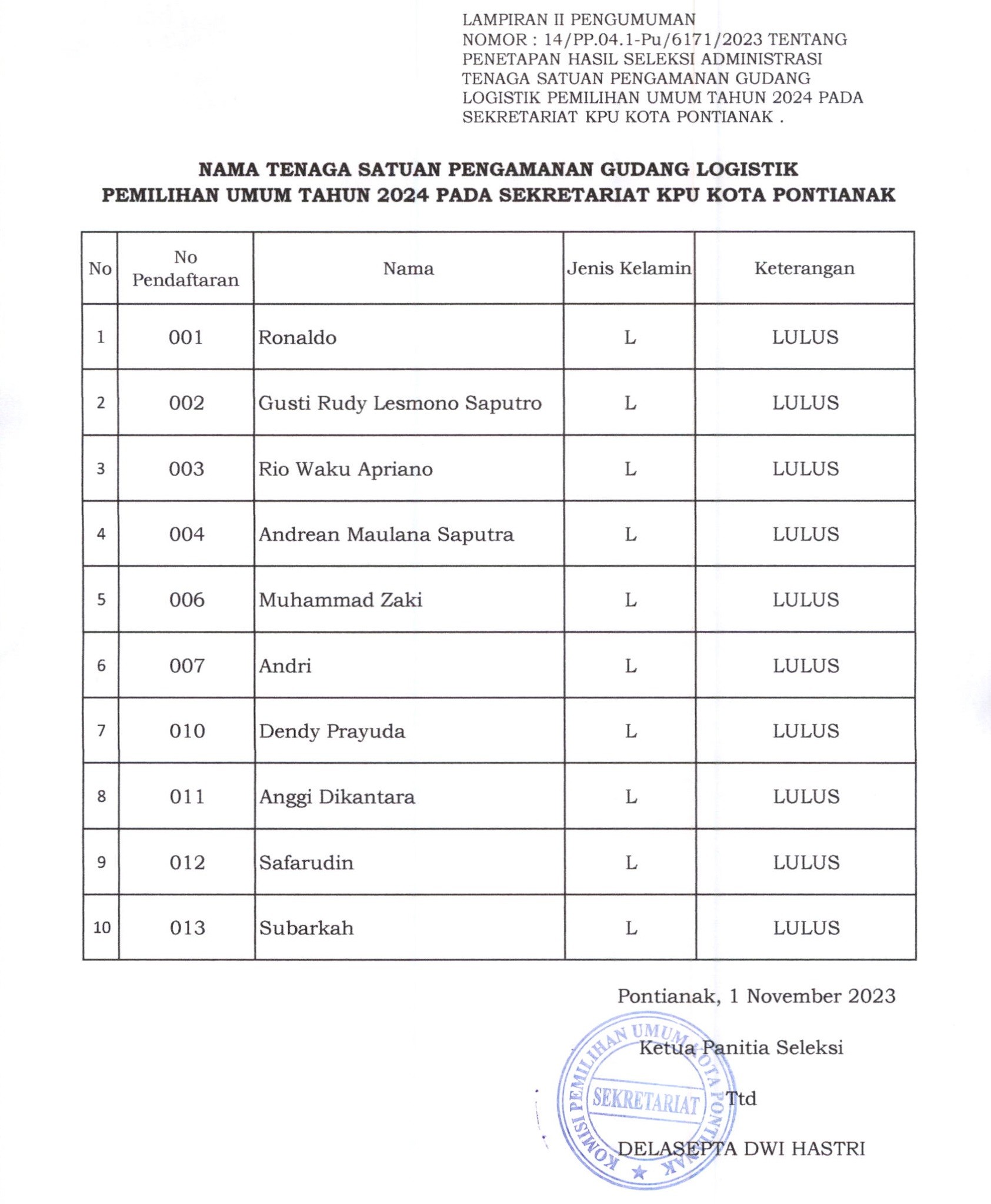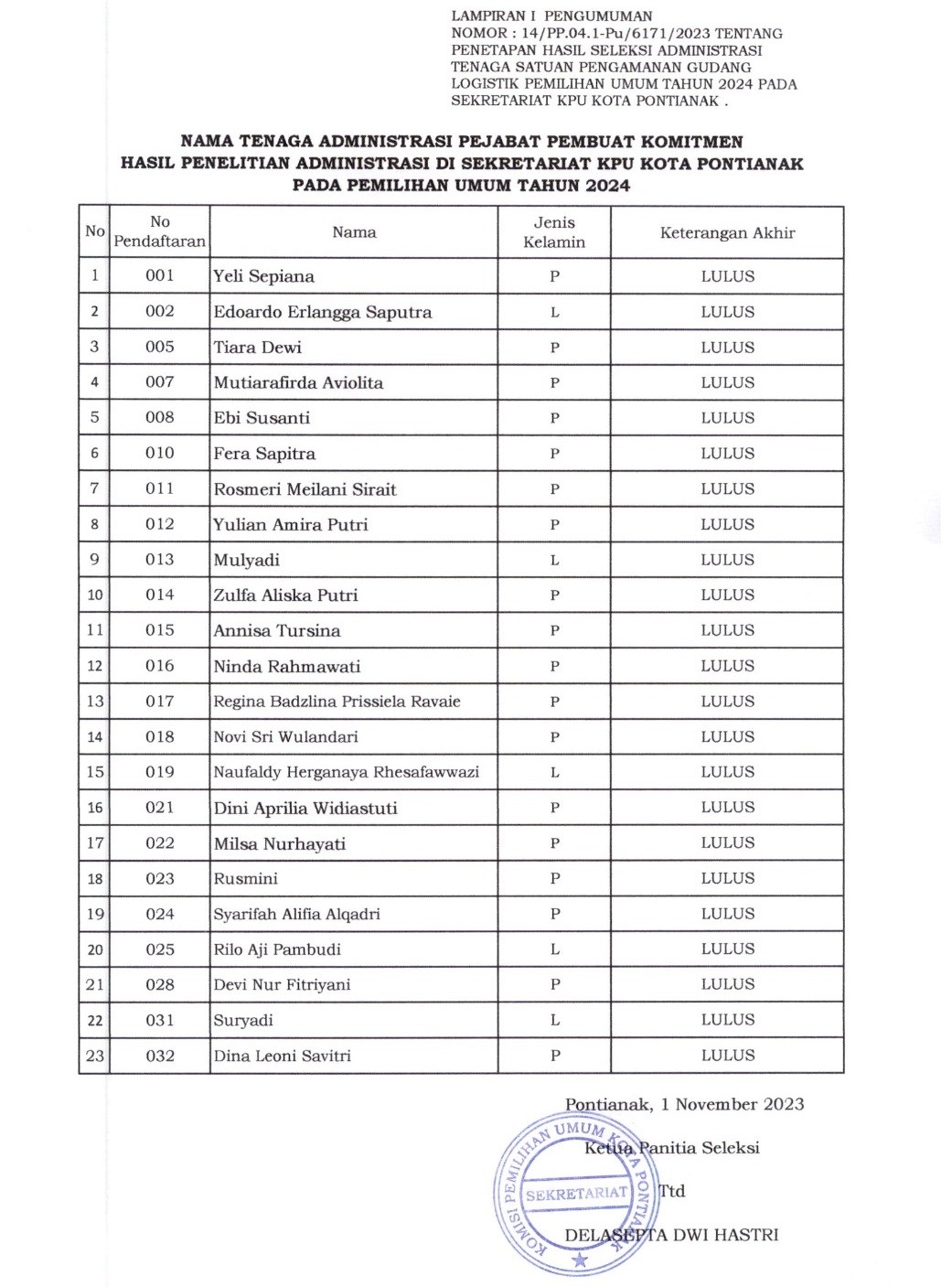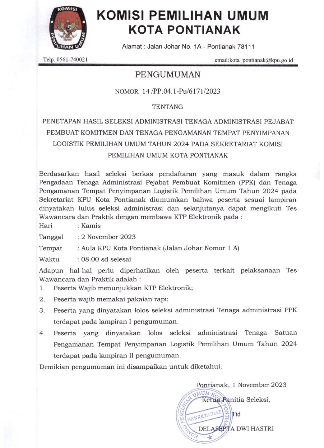PENETAPAN HASIL SELEKSI ADMINISTRASI TENAGA ADMINISTRASI PEJABAT PEMBUAT KOMITMEN DAN TENAGA PENGAMANAN TEMPAT PENYIMPANAN LOGISTIK PEMILIHAN UMUM TAHUN 2024 Rabu, 01 November 2023 16:00 415 FIle PDF: PENETAPAN HASIL SELEKSI ADMINISTRASI TENAGA ADMINISTRASI PEJABAT PEMBUAT KOMITMEN DAN TENAGA PENGAMANAN TEMPAT PENYIMPANAN LOGISTIK PEMILIHAN UMUM TAHUN 2024 PADA SEKRETARlAT KOMISI PEMILIHAN UMUM KOTA PONTIANAK Bagikan: Dilihat 415 Kali.