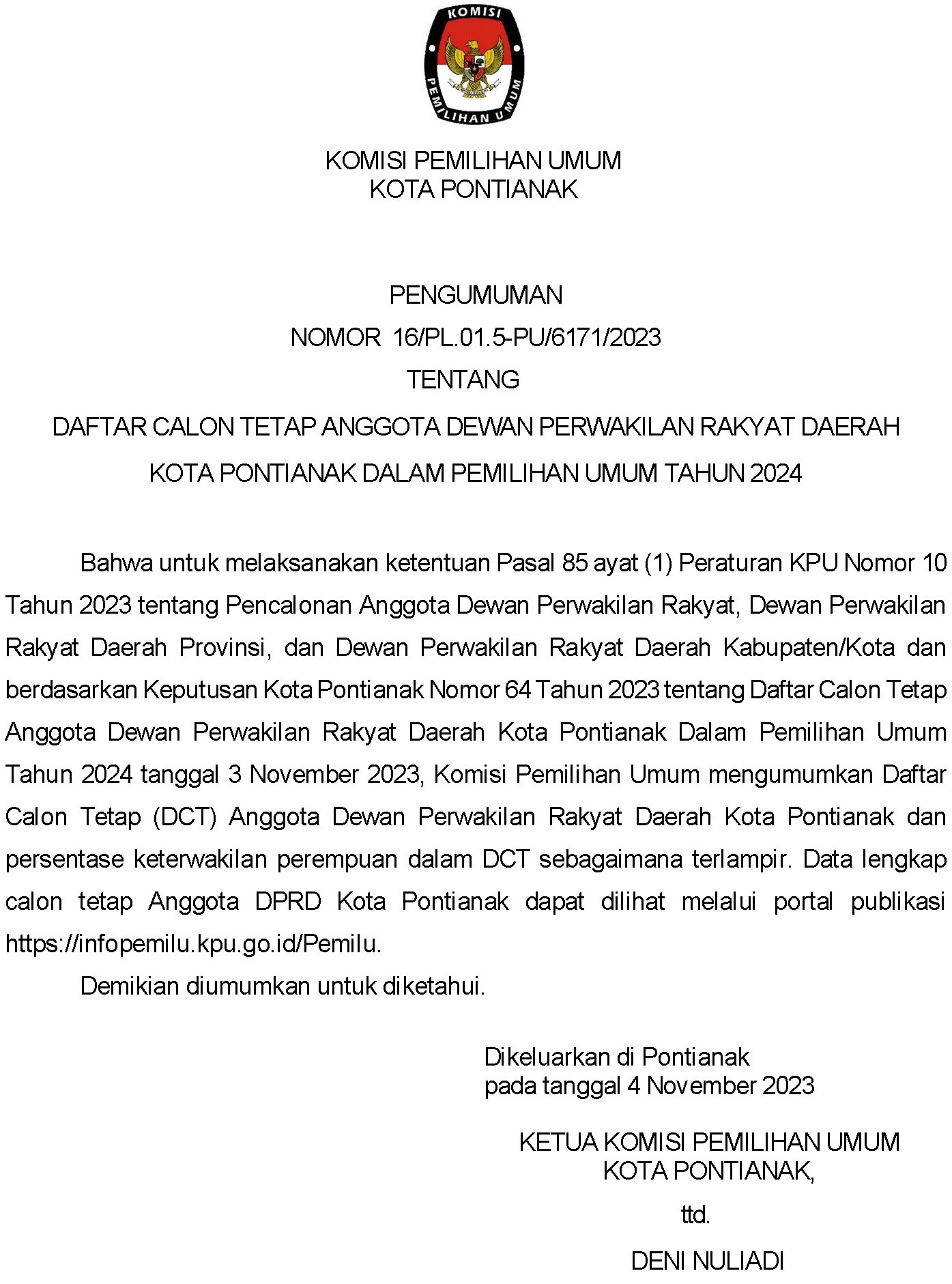 PENGUMUMAN DAFTAR CALON TETAP ANGGOTA DEWAN PERWAKILAN RAKYAT DAERAH KOTA PONTIANAK DALAM PEMILIHAN UMUM TAHUN 2024