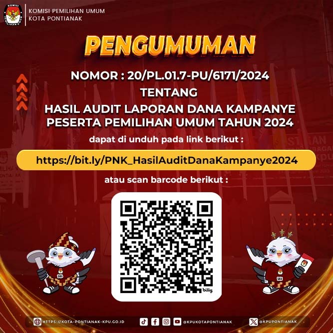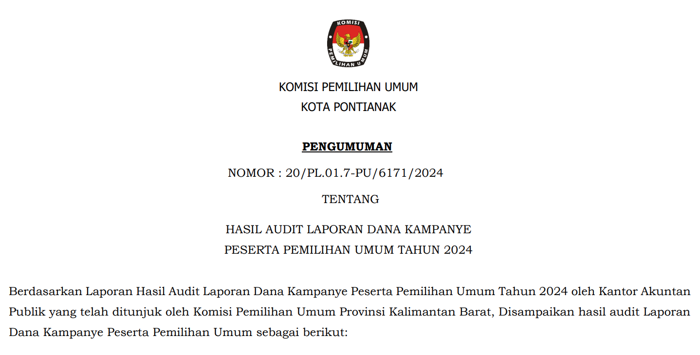 Pontianak, kota-pontianak.kpu.go.id/ - Pengumuman Nomor 20/PL.01.7-PU/6171/2024 Tentang Hasil Audit Laporan Dana Kampanye Peserta Pemilihan Umum Tahun 2024.