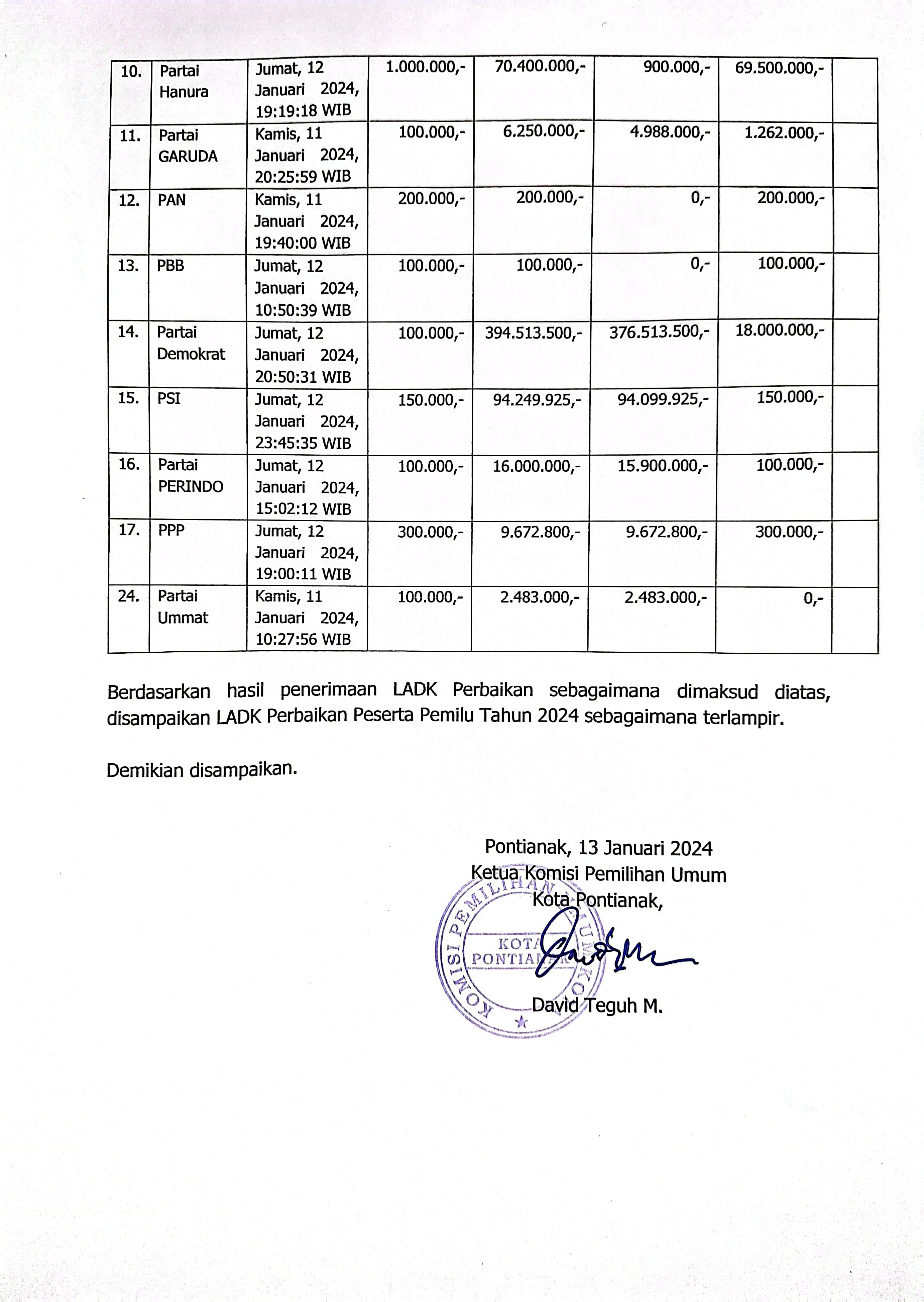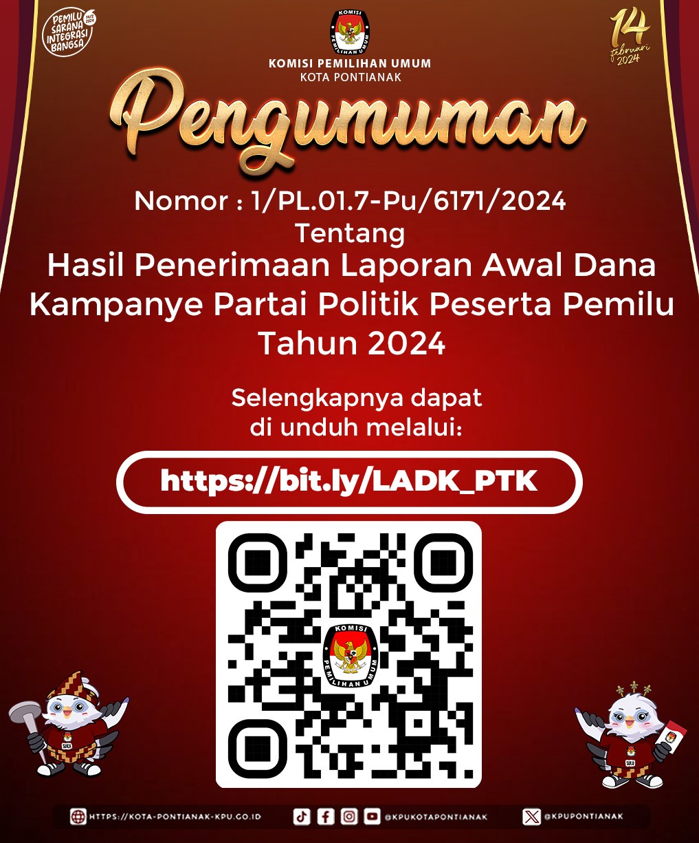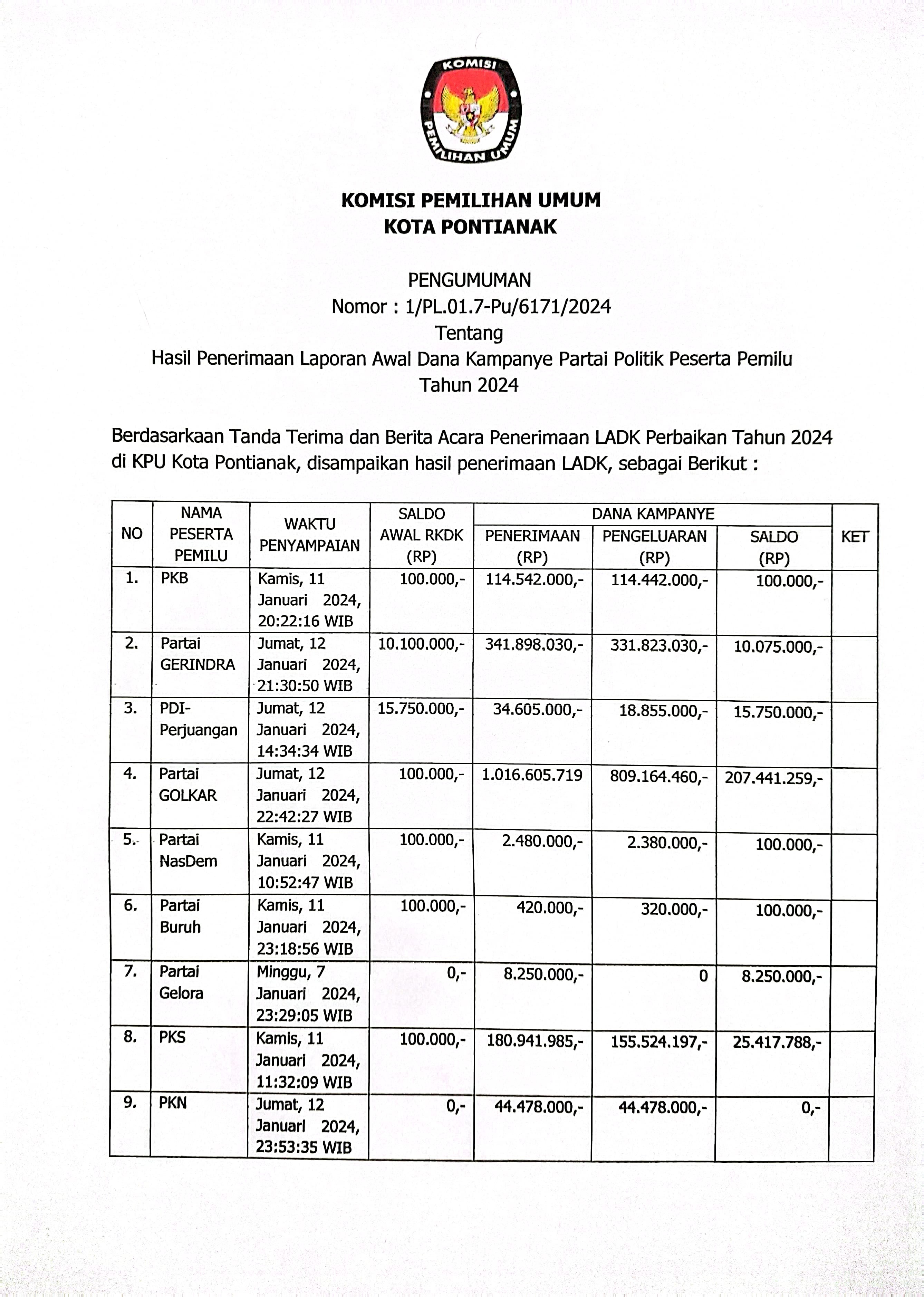 Berikut kami sampaikan Pengumuman Hasil Penerimaan Laporan Awal Dana Kampanye Partai Politik Peserta Pemilu Tahun 2024 Tingkat Kota Pontianak.