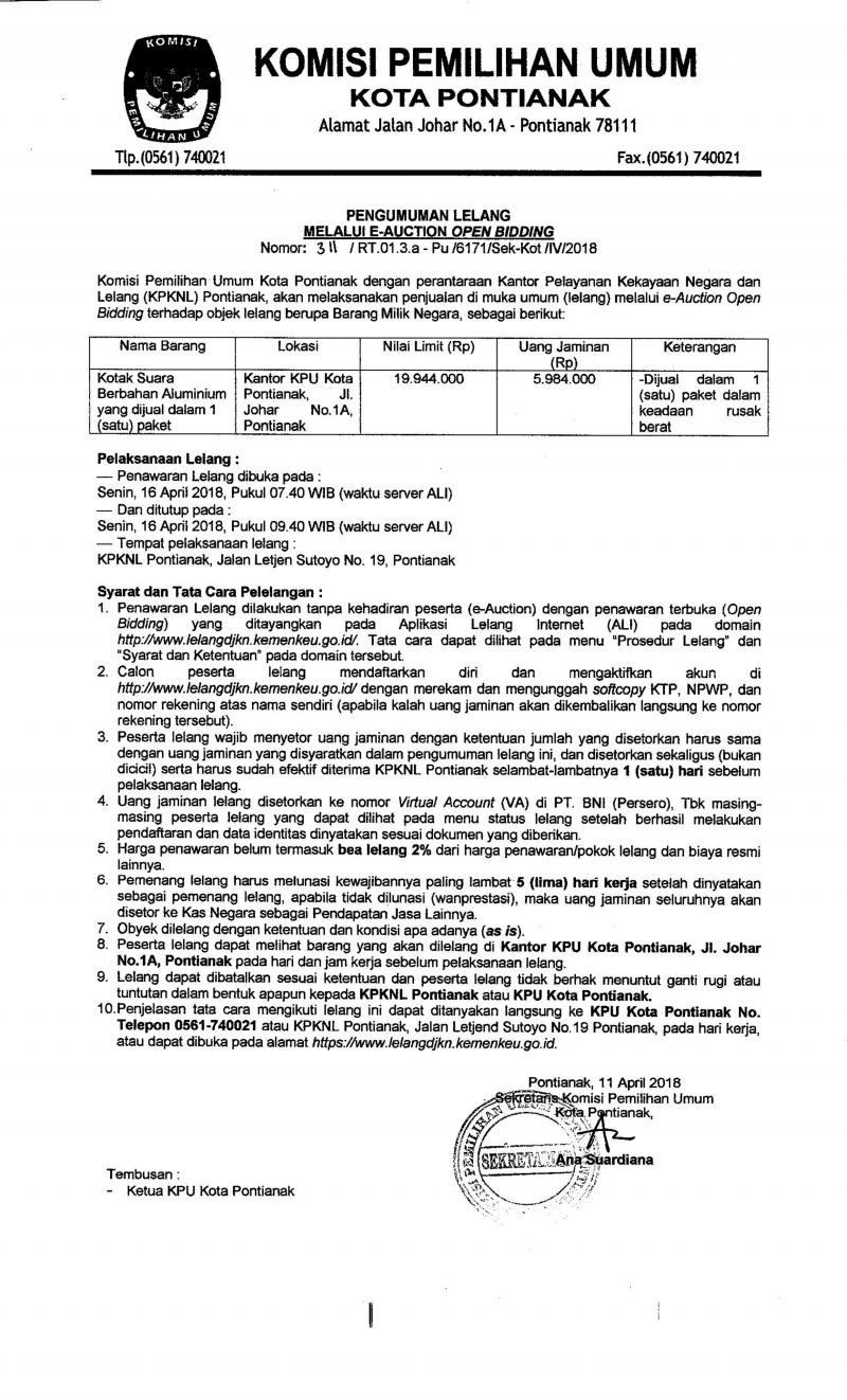 Pengumuman Lelang Melalui E-Auction Open Bidding (Kotak Suara Aluminium)