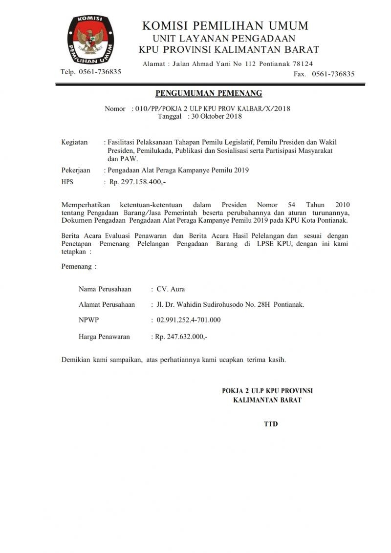 Pengumuman Pemenang Pengadaan Alat Peraga Kampanye Tahun 2019 untuk KPU Kota Pontianak