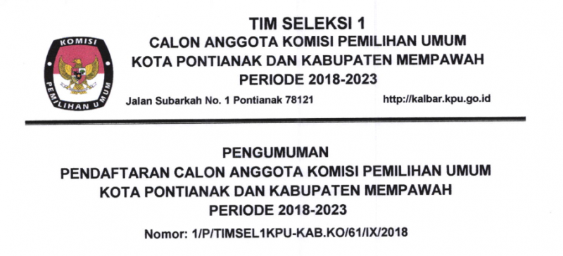 Berdasarkan ketentuan Pasal 19 ayat (3) Peraturan Komisi Pemilihan Umum Nomor 7 Tahun 2018 tentang Seleksi Komisi Pemilihan Umum Provinsi dan Komisi Pemilihan Umum Kabupaten/Kota, Tim Seleksi 1 Calon Anggota Komisi Pemilihan Umum Kabupaten/Kota Provinsi Kalimantan Barat menerima pendaftaran bagi warga negara Indonesia yang berdomisili di Kota Pontianak dan Kabupaten Mempawah yang memenuhi persyaratan untuk mendaftarkan diri sebagai Calon Anggota Komisi Pemilihan Umum Kabupaten/Kota Periode 2018-2023.