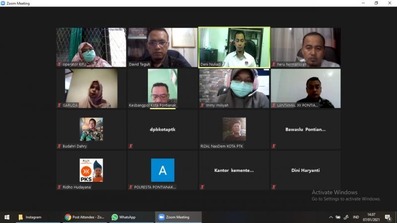 Pontianak, kpu-pontianakkota.go.id - KPU Kota Pontianak menggelar Rapat Pleno Pemutakhiran Data Pemilih Berkelanjutan periode Bulan Desember 2020 secara daring, Kamis 7 Januari 2021 mulai pukul 13.30 WIB. Hadir dalam rapat Pleno ini Ketua KPU Kota Pontianak beserta Anggota, Ketua Bawaslu Kota Pontianak, Kepala Kesbangpol Kota Pontianak, Perwakilan Partai Politik, Perwakilan Disdukcapil Kota Pontianak, dan Perwakilan Kemenag Kota Pontianak, Perwakilan Polresta Kota Pontianak dan Perwakilan Lantamal.