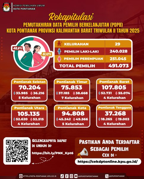 Berikut adalah Rekapitulasi Pemutakhiran Data Pemilih Berkelanjutan (PDPB) Kota Pontianak Provinsi Kalimantan Barat Triwulan II Tahun 2025, dapat dilihat pada infografis....