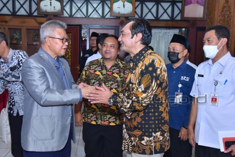 Hadir pada pertemuan tersebut, Wakil Ketua MPR RI Ahmad Muzani, Ketua dan Anggota KPU Provinsi Jateng Paulus Widiyantoro dan Henry Wahyono, Bupati Sukoharjo Etik Suryani, dan Forkompinda Kabupaten Sukoharjo. (humas kpu ri ook/foto: ook/ed diR)