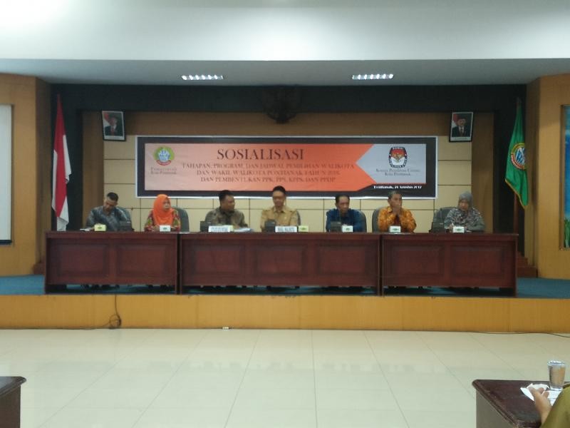 Pontianak, kpu-pontianakkota.go.id - Bekerja sama dengan Pemerintah Kota Pontianak, KPU Kota Pontianak melaksanakan kegiatan Sosialisasi Tahapan, Program, dan Jadwal Pemilihan Walikota dan Wakil Walikota Pontianak Tahun 2018, dan Pembentukan PPK, PPS, dan KPPS di Aula Sultan Syarif Abdurrahman Kantor Walikota Pontianak, Senin (21/8). Acara yang dihadiri oleh para lurah, camat, kepala kesbangpol, serta beberapa undangan lain di lingkungan Kota Pontianak itu dibuka oleh Wakil Walikota Pontianak Ir. H. Edi Rusdi Kamtono, MM., MT.
